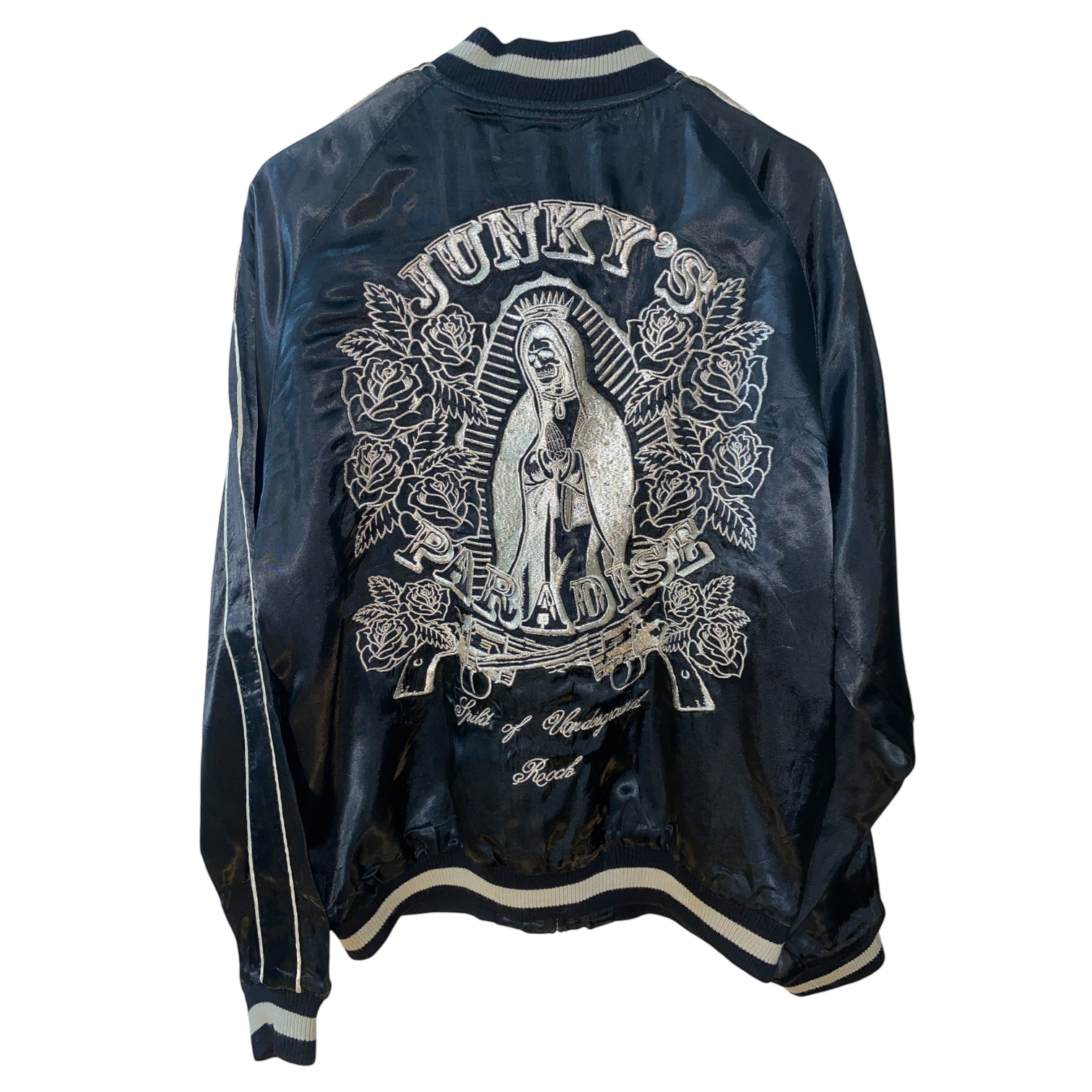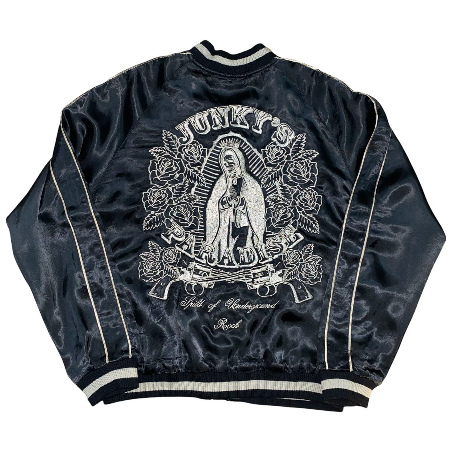 Primary Side: Deep midnight black with ivory piping, showcasing an intricate back embroidery of a Skeleton Nun figure surrounded by blooming roses and twin pistols, framed by the text “Junky’s Paradise, Spirit of Underground Rock.”