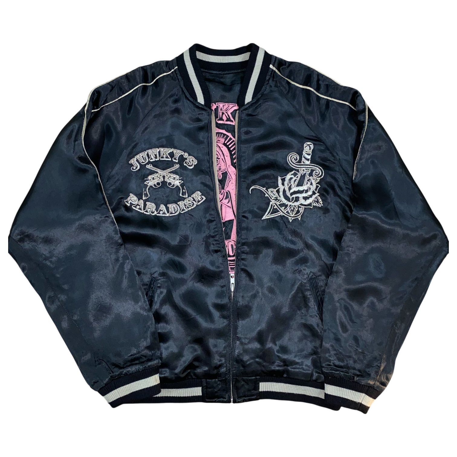 Crafted from satin, this reversible sukajan features two striking sides: